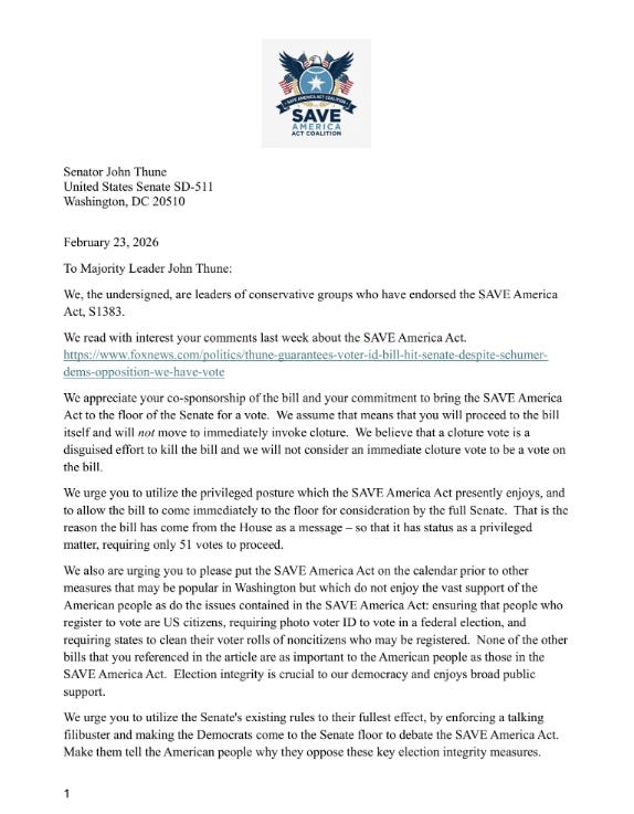 80 prominent conservative organizations sign on to the SAVE America Act Coalition, urging @LeaderJohnThune to bring the SAVE America Act immediately to the floor for consideration by full Senate