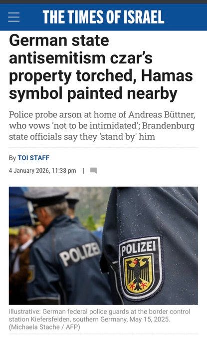 ATTEMPTED MURDER of antisemitism czar in Germany.Elena FeliciaJan 05, 2026ShareATTEMPTED MURDER of antisemitism czar in Germany.“His family was at home when the arson occurred.”This happened yesterday, and the perpetrators are likely immigrant Muslims.Of course, they would never say that.But we all know.