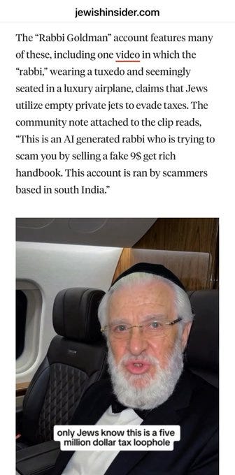 One of the most ridiculous examples: “Rabbi Goldman,” a fake scam account with 1.4 MILLION followers dressed up as a Jewish Rabbi and fed into the algorithm.
