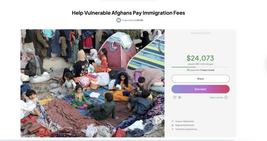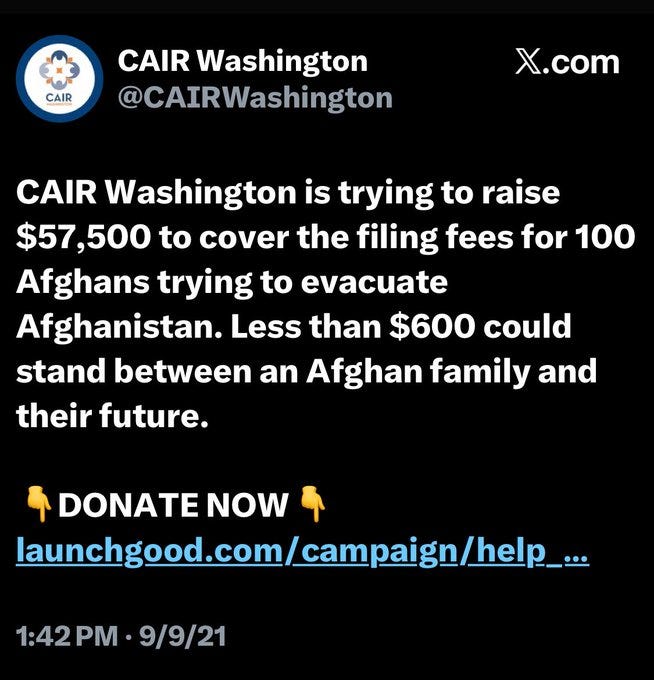 CAIR - a group repeatedly cited in federal evidence for its Hamas network ties - WAS FUNDRAISING TO BRING EVEN MORE AFGHANS THROUGH THAT SAME PIPELINE.