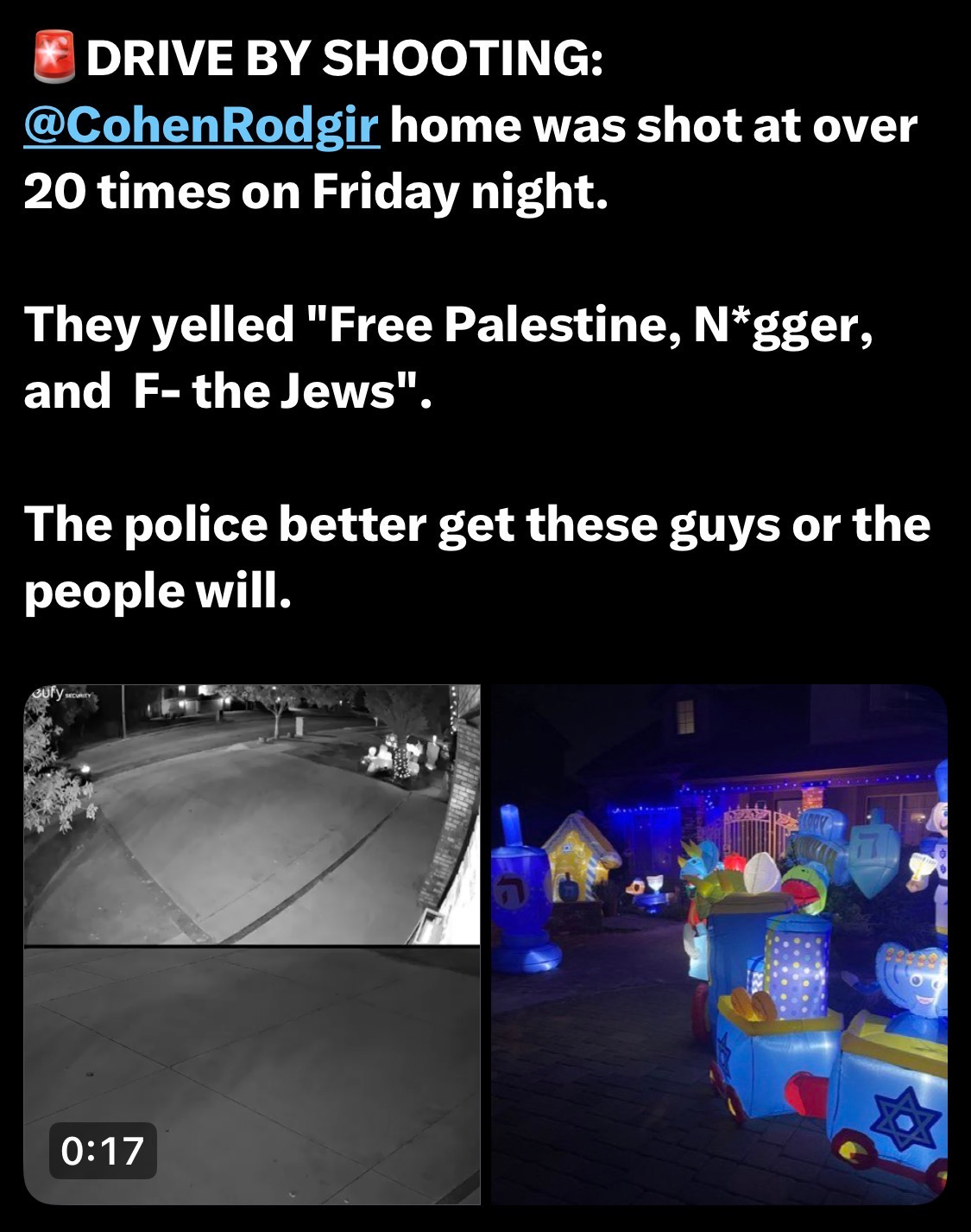 Playback speed×Share postShare post at current timeShare from 0:000:00/0:00Transcript🚨DRIVE BY SHOOTING: Targets Jewish HomeShirion CollectiveDec 14, 2025ShareTranscriptRodgir Cohens home in Redlands, California was shot at over 20 times on Friday night. They yelled "Free Palestine, N*gger, and F- the Jews". The police better get these guys or the people will.They were shooting at this Hanukkah display Discussion about this videoCommentsRestacksShirion CollectiveSubscribeAuthorsShirion CollectiveRecent PostsHistory of Islam in America: 2013 Boston Marathon Bombing17 hrs ago • Shirion CollectiveGerman police handle the "Free Palestine" hate group PERFECTLYDec 6 • Shirion CollectiveYuri Bezmenov: KGB Spy Explains Stages of an Ideological TakeoverDec 1 • Shirion Collective