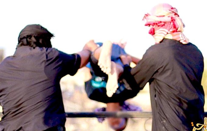 This now-infamous image captures proud Muslim executioners hurling a homosexual man to his death from a tall building.