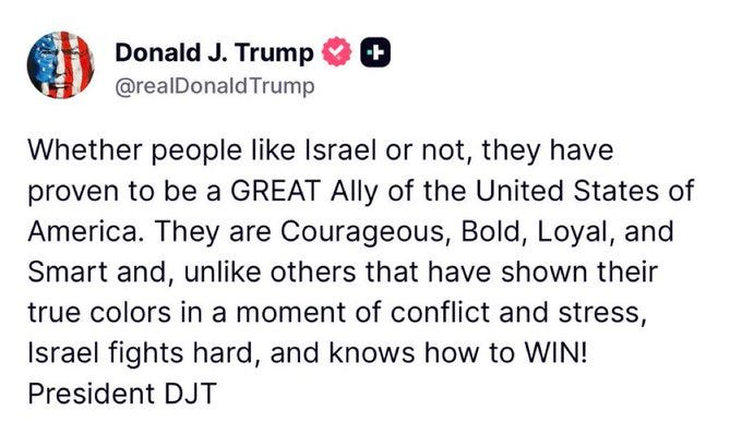 Jews, Whether you like him or not... Donald Trump is a true friend to Israel. Elena FeliciaApr 19, 2026ShareWhether you like him or not...Donald Trump is a true friend to Israel. Thank you @POTUS