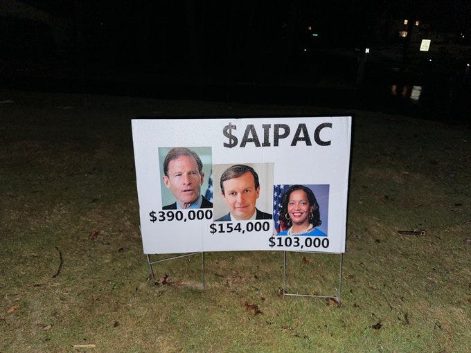 One Avon resident in the Woodhaven area is brainwashed enough to plant a homemade sign obsessing about AIPAC.
