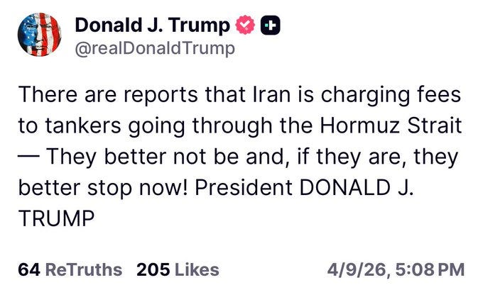 PREDICTION: The "ceasefire" ends soon.Elena FeliciaApr 10, 202611SharePREDICTION: The "ceasefire" ends soon.Some evidence @JudeanGeneral ll@judeangeneral2ยทTRUMP THREATENS IRI ON SOH Trump just warned IRI not to charge toll on access to SOH. Huge escalation. This ceasefire wonโt last long.