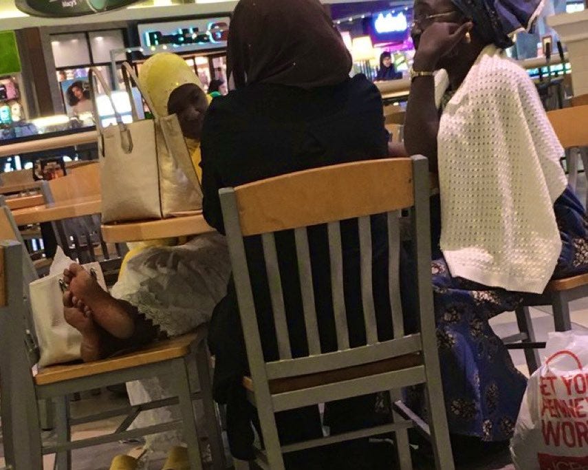Here is another photo of MILLIONAIRE SOMALI MUSLIMS with their gross feet out after buying tons of new designer stuff with YOUR money.
