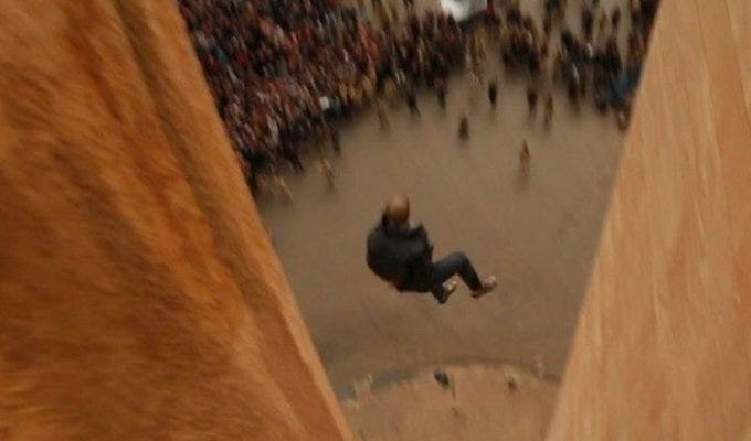 This disturbing photograph shows a man falling to his death after being thrown off a roof by Muslims.